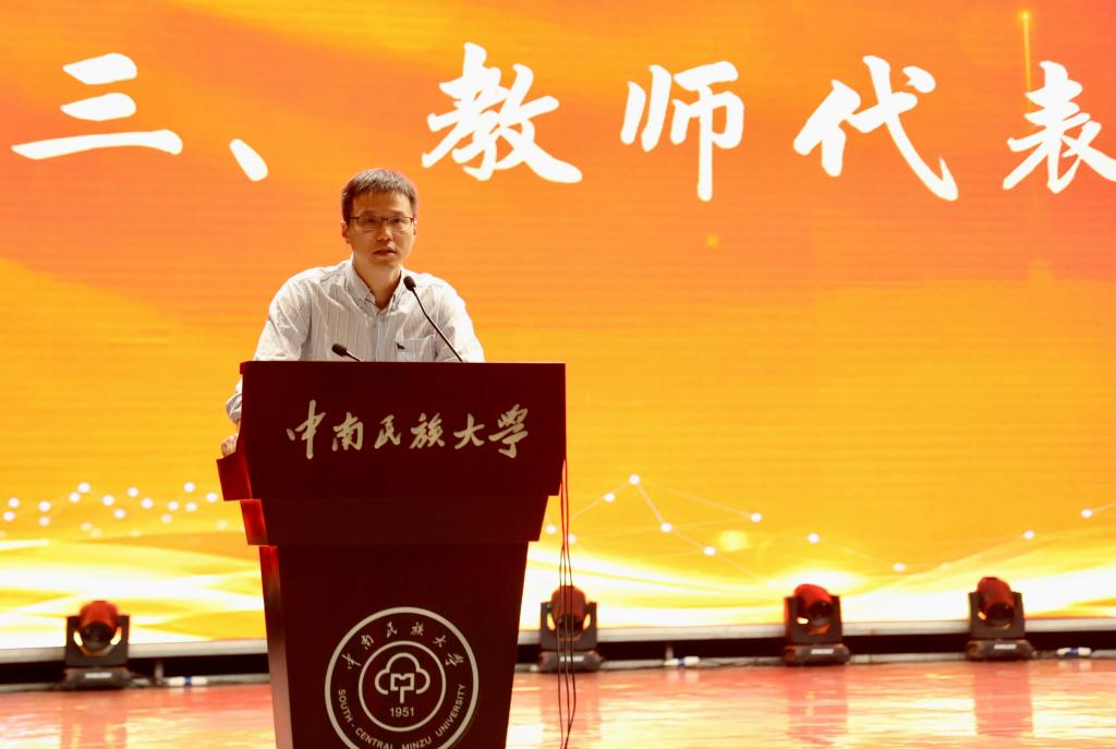 教师代表李峰结合自己在民大多年的学习工作经历,用“过来人”身份向2023级新生对提出建议:多看、多思、多实践。他表示大学学科的专业性、研究性学习与中小学基础性、常识性学习存在显著不同,鼓励同学们勤学多问,独立思考。