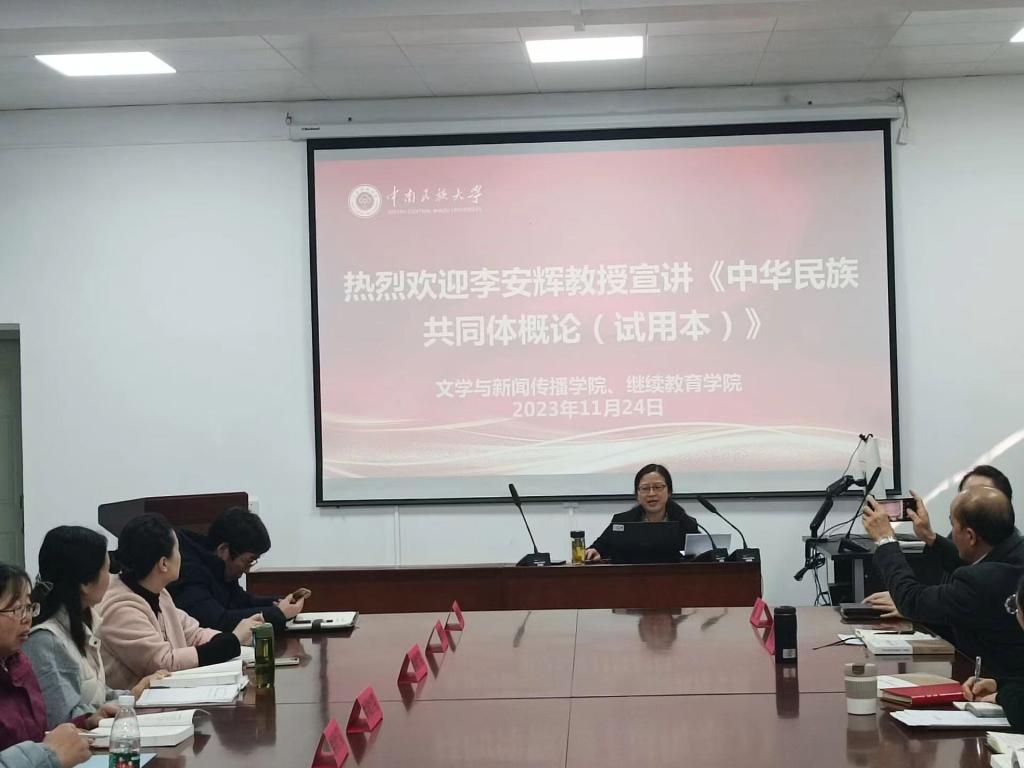 本站讯(通讯员钱璐 摄影刘卓尔)为进一步落实《中华民族共同体概论(试用本)》的学习和试讲试用工作,根据国家民委党组的统一部署和学校党委要求,11月24日上午,文学与新闻传播学院党委、继续教育学院党总支联合组织开展学习《中华民族共同体概论(试用本)》宣讲。宣讲专家为中华民族共同体学院(研究院)李安辉教授,文学与新闻传播学院、继续教育学院教职工参加学习。