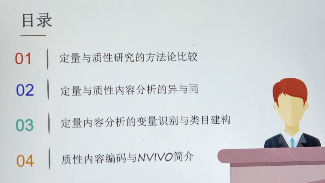 周翔教授从定量与质性研究的方法论比较、定量与质性内容分析的异与同、定量内容分析的变量识别与类目建构和质性内容编码与NVIVO简介四个方面,讲述定量与质性内容分析比较。