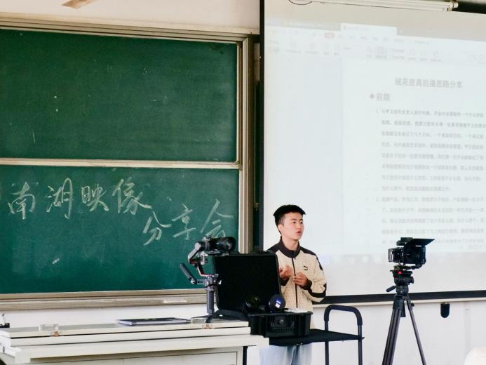 分享宝贵经验,助力更好前行。三位学长在会上分别向在座同学们展示在“南湖映像”影视作品大赛中获奖的作品。《寻美中华——张掖篇》在大赛中获得最佳剪辑奖、最佳音像奖,其导演潘宇将镜头落在张掖的美食文化、建筑文明的睄点上,将张掖遥远的历史与现代风情相融合,将“不望祁连山顶雪,错把张掖当江南”具象化,向观众们展现了一个底蕴深厚、生生不息的张掖。《石榴百籽,万籽千红》的两位导演潘宇、郑爽齐摘最佳导演奖,作品立意高远,将寓意民族团结的石榴籽与绒花技艺结合,用生动的视听语言向观众们诠释了“各民族像石榴籽一样紧紧拥抱在一起”的丰富内涵。
