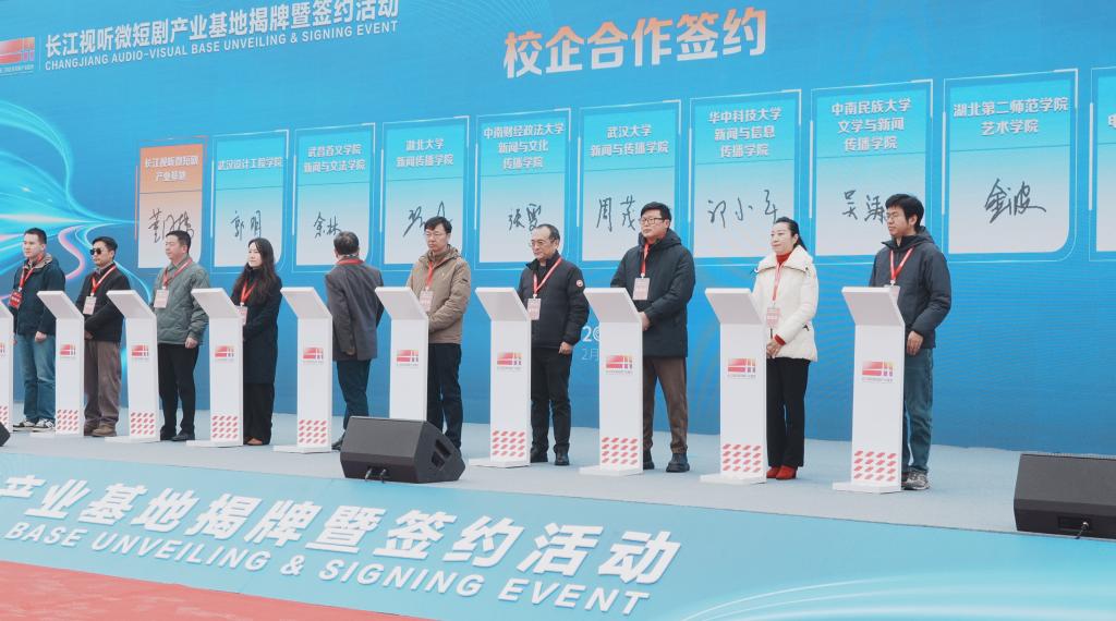 本站讯(通讯员田曼阳 摄影潘宇)2月25日,长江视听微短剧产业基地揭牌暨签约活动在武汉东站西广场成功举办。湖北省委宣传部一级巡视员陶宏家,省广播电视局党组成员、副局长张红艳出席活动并讲话。省文化和旅游厅二级巡视员童建新,武汉市委宣传部副部长杜健梅,共青团武汉市委副书记吴海东,武汉东湖新技术开发区党工委委员黄磊等领导出席并参加系列活动。我院实验中心吴涛主任参加此次活动并参与校企合作签约。