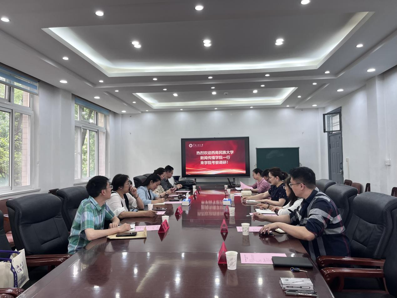 (通讯员 王泽光 张巍巍)4月17日,西南民族大学新闻传播学院党委书记陈茹心、党委副书记李亚星一行莅临我院进行调研,我院党委书记谢岚、党委副书记牛磊及双方学院教师代表、辅导员代表参加座谈会,双方围绕党建工作、专业教学、学生思政教育和日常管理、校园文化建设、大学生心理健康教育等内容进行座谈。