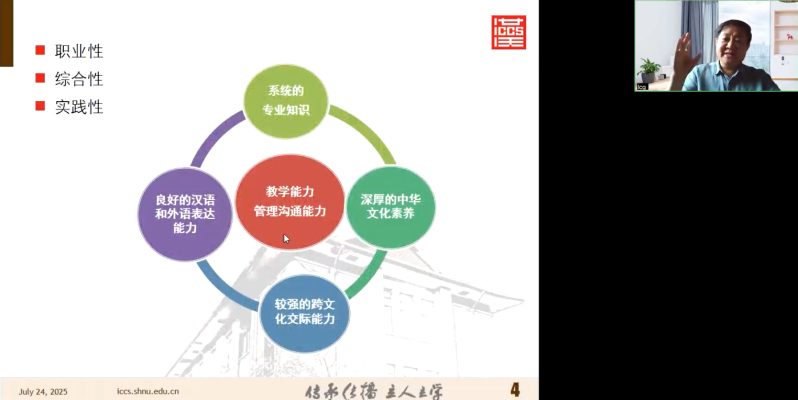 刘春光老师首先分析了参与专业赛事的积极意义。国际中文教育专业硕士需具备坚定的政治立场、系统的专业知识、深厚的中华文化功底、突出的管理沟通能力、良好的汉语和外语表达能力、较强的跨文化交际能力等素养。而参与专业赛事,正是快速提升教学方法和技巧、实现培养目标的有效途径。