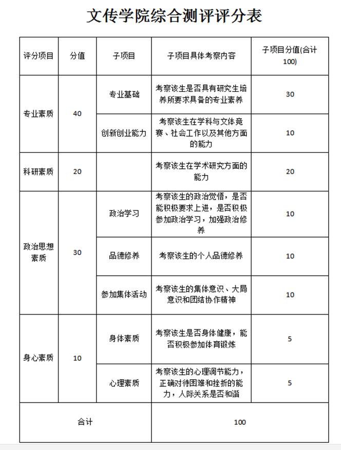 (3)综合测评:根据各专业推免生名额的1.5倍确定进入综合测评环节学生名单。具体名单另行通知。综合测评采用面试形式,由专家小组给定成绩。具体评分标准见附件。