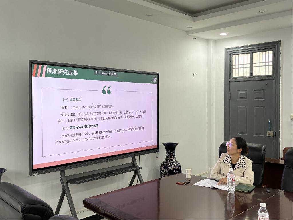 本站讯(通讯员:李妍 摄影:李妍)11月12日下午,2024年语言学国社科基金项目开题报告会暨2025年国社科基金项目申报第一轮论证会在文一楼203会议室顺利举行。项目负责人熊英副教授就《‘土·汉’接触下的土家语历史演变层次研究》进行开题汇报,华中师范大学汪国胜教授、华中科技大学程邦雄教授、学院邵则遂教授、谢荣娥教授、李素秋教授作为专家组成员参与本次会议。学院院长陶喜红教授主持本次会议。