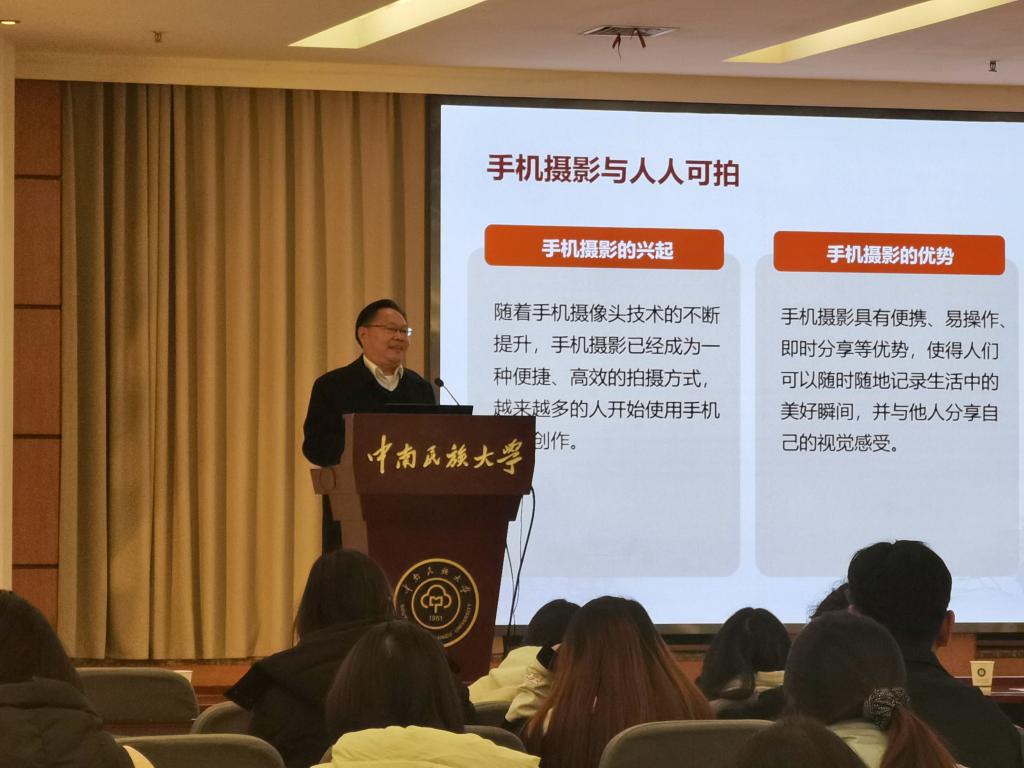 本站讯(通讯员:李妍 摄影:李妍)11月27日晚上,学院邀请湖北省文联党组成员、副主席马尚云在学术交流中心润良报告厅做《走进摄影艺术的世界》讲座。学院院长陶喜红教授主持讲座,学院部分教师、博士生、硕士生及本科生参加。