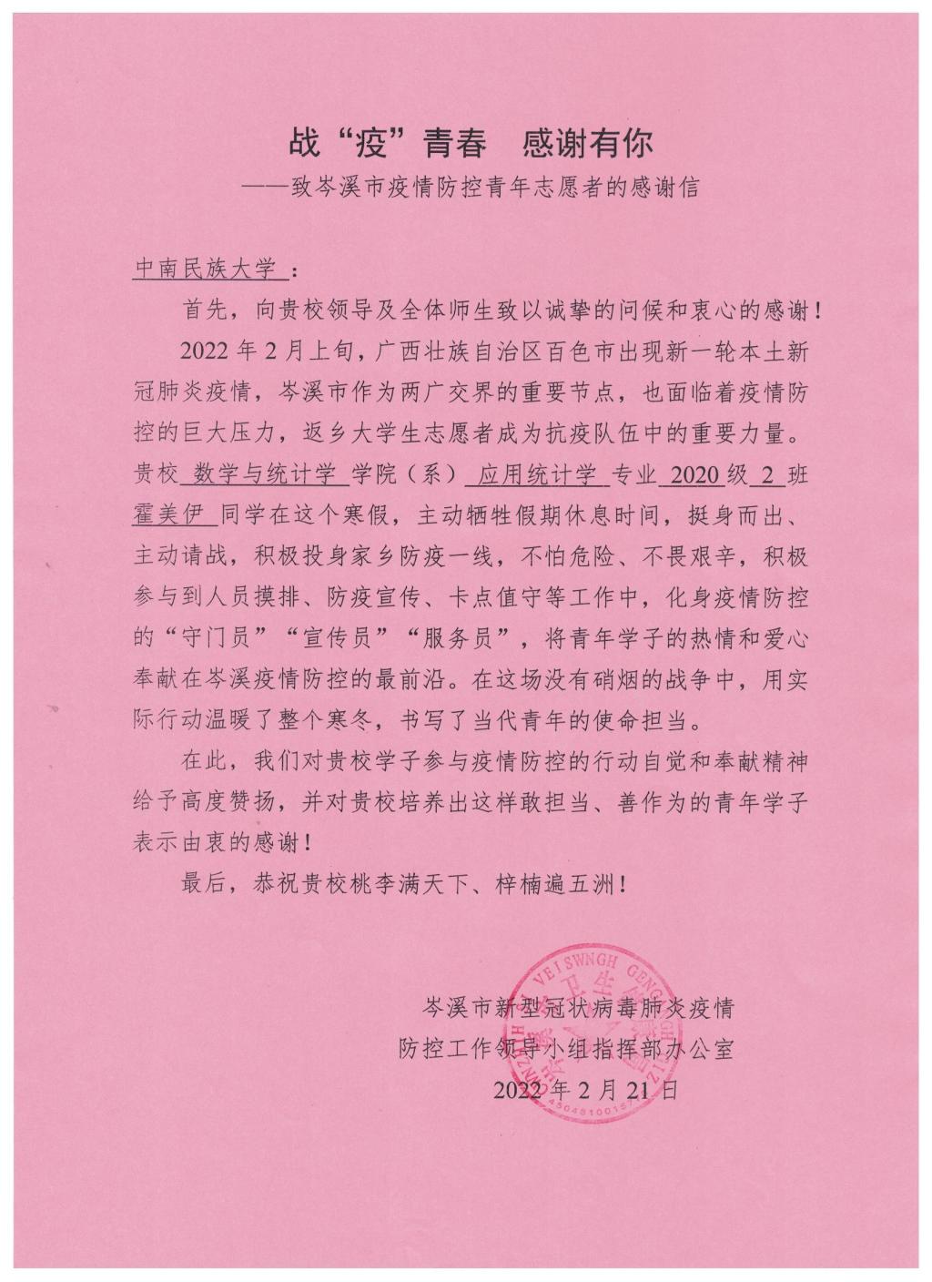 战“疫”青春 感谢有你——岑溪市致我院青年志愿者的感谢信