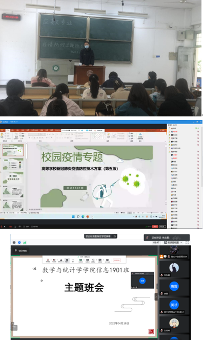 2022年4月16日至17日,数学与统计学院各班分别于线上线下开展举行“疫情防控”主题班会。各班班导师及全体学生参加班会活动。