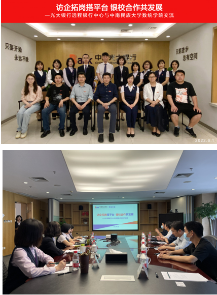为深入贯彻落实教育部“全国高校书记校长访企拓岗促就业专项行动”,深化产教融合校企合作,6月1日,院党委书记李海涛带队,副院长夏永波、党委副书记郭琳、应用数学教研室主任彭超权、统计学教研室主任王维峰以及毕业班辅导员张箐沁等一行6人赴光大银行远程银行中心武汉分中心进行考察交流,武汉分中心负责人李艳芳处长、经理易珉等参与接待与交流。