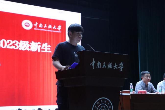 2023级本科生余潇作为新生代表发言。余潇分享了军训感悟,表达了对大学生活的憧憬与向往。他认为,大学是新的起点,要以一往无前的勇气面对前路,以坚韧不拔的毅力步步前行,为自己在民大拼搏出一个无悔的青春。