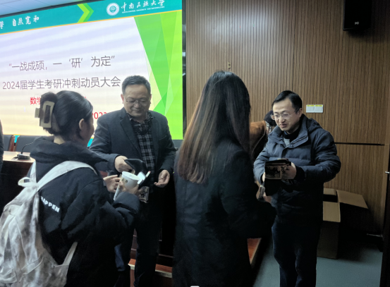 会后,院领导为参会的考研学子发放了学院准备的考研福袋,橙子代表着心想事成,可乐寓意未来可乐,祝愿每一位数统学院的考研学子都能取得100%满意的结果。