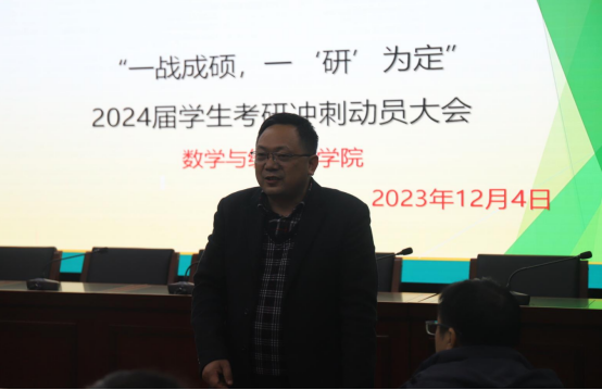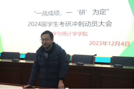 为缓解2024届考研学子备考压力,增强考试信心,提振复习冲刺阶段的士气与决心,2023年12月4日下午,我院在9号教学楼309会议室举行2024届考研冲刺动员会,学院党委书记郭晖、院长胡军浩、党委副书记宋荣、副院长佘纬出席本次大会,会议由2020级辅导员张帆主持。