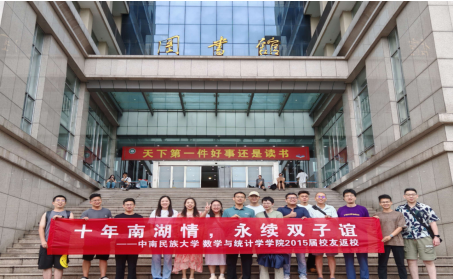 南湖微澜映长柳,双子塔影忆韶华。6月7日,数学与统计学学院2015届等18位校友重返母校,以“毕业十周年·青春再相聚”为主题开展活动。来自数学与应用数学、信息与计算科学、应用统计学3个专业的陈书东等校友,学院党委书记郭晖、党委副书记宋荣、副院长夏永波、佘纬,教师代表田凡、娄联堂、龙爱芳、牛艳庆、周静和刘鹍以及学生志愿者共同参与一系列生动活泼的活动,共叙师生情谊,共绘发展新篇。