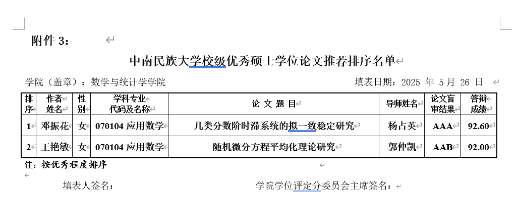 根据研究生院《关于开展2025年度校级优秀研究生学位论文评选工作的通知》、2022级硕士研究生学位论文匿名评审结果以及两个答辩小组的评分结果,拟向研究生院推荐2022级硕士研究生邓振花、王艳敏的硕士学位论文为2025年校级优秀硕士学位论文。