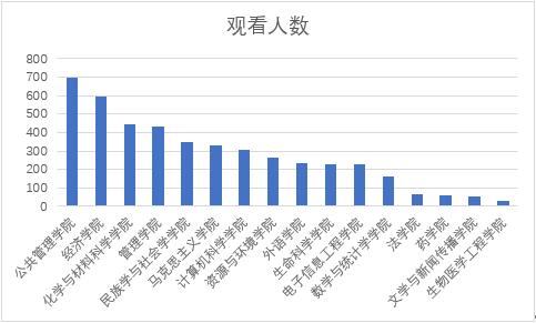 据后台统计,9月6日至9月18日,共有16个学院采用了直播模式进行授课,共计发起255场有效上课直播,累计观看人数达4484人。其中,公共管理学院发起的上课直播累计观看人数最多,高达699人,其他学院上课直播情况如图2所示。