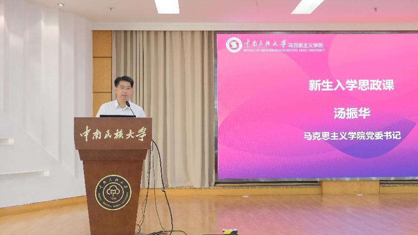 汤振华为新生讲授入学首堂思政课。他以“在知行合一中做善良、正直的人”为主题,通过“李福贵”以善行改变命运的真实案例,引出对正直、善良、奉献的解读,并系统阐释了十篇中华经典篇章的深刻意涵。从庄子《逍遥游》的宏阔视野,到司马迁《报任安书》的忍辱负重,再到《岳阳楼记》“先忧后乐”的家国情怀、《赤壁赋》的超然通达,他着重阐释了中华优秀传统文化中为学与成人的统一性。他勉励同学们要在知行合一中积淀丰厚学识、锤炼品德修为、勇担时代重任、主动担当作为,努力实现人格与学识的共同成长。