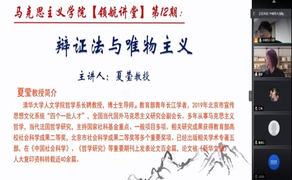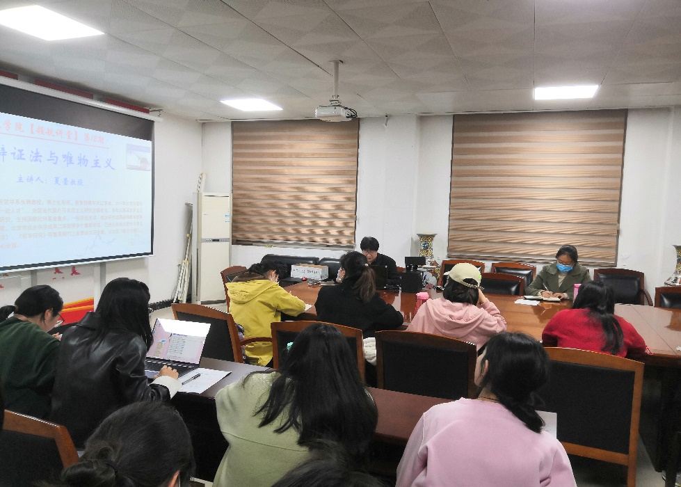 为开阔我院研究生学术视野,提高马克思主义理论修养和水平,4月8日晚,马克思主义学院“领航讲堂”第十二讲通过线上线下相结合的形式展开。清华大学人文学院哲学系长聘教师、博士生导师、教育部青年长江学者、全国当代国外马克思主义研究会副会长夏莹教授应邀为我院师生作题为“辩证法与唯物主义”的学术报告。本次讲座由学院院长杨金洲主持,各教研室教师以及2019级、2020级研究生参加此次讲座。