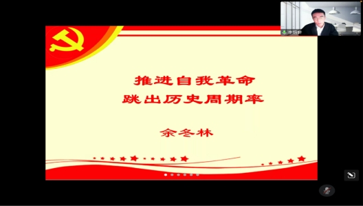 余冬林教授以将党的自我革命与跳出历史周期率的第一个答案相结合方式为切入点:“革命”的语义变迁过程、1945年毛泽东指出我们跳出历史周期率的第一个答案就是民主,让人民来监督政府。在百年奋斗历程中,党领导人民取得一个又一个伟大成就、战胜一个又一个艰难险阻,历经千锤百炼仍朝气蓬勃,得到人民群众的支持和拥护。