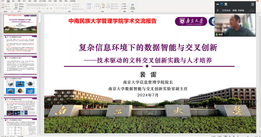2024年7月25日上午,南京大学教授、博士生导师、信息管理学院院长裴雷教授受邀到我院开展主题为《复杂信息环境下的数据智能与交叉创新》的讲座。此次讲座线上进行,管理学院师生参加会议。