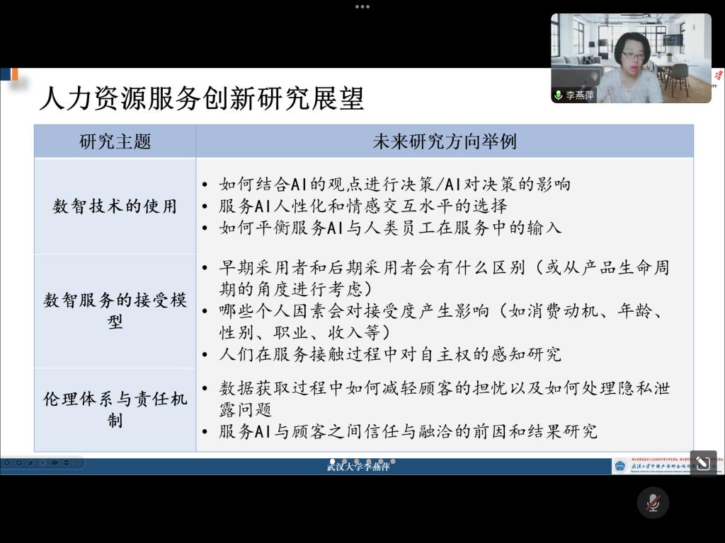 讲座还深入探讨了数智化赋能人力资源服务创新动力和具体路径。李教授指出数智化赋能人力资源管理必将成为我国人力资源企业发展的必然趋势,并列举了数智化赋能在人力资源管理中的具体应用。李教授还认为,我国企业人力资源数智化从智能化的方向上看就是要实现两个智能:流程智能和决策智能。在谈到人力资源服务企业创新发展路径时,李教授结合她和她的团队所做的案例研究进行了详细的介绍,并提出了技术发展与进步、重塑服务与消费、员工和劳动力市场、跨界与产业融合这四条人力资源服务企业创新路径。最后李教授还对人力资源服务创新研究进行了展望,提出了一些研究主题以及未来可以研究的具体方向。