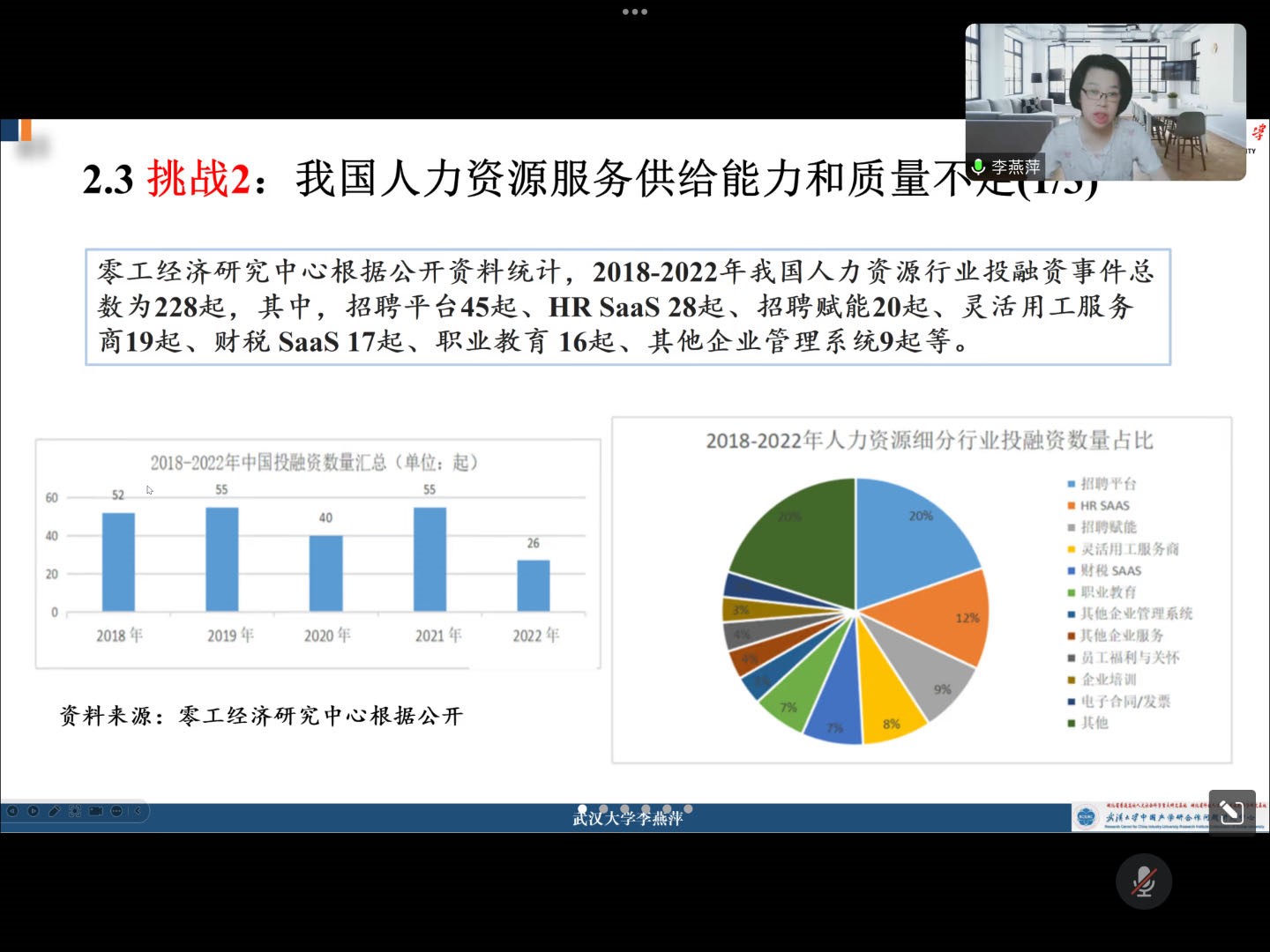 李教授在讲座中还具体介绍了我国人力资源服务企业的现状、机遇和挑战。她结合人力资源服务机构的数量、总营业收入、从业人员、服务用人单位次数、国家产业园建成数量等数据指出,我国的人力资源服务企业规模和业务持续增长并呈集聚化、集团化、品牌化的发展趋势。同时,李教授还从政府的重视、新时代发展的需要以及数字经济的发展三个角度具体阐述了我国人力资源服务企业发展所面临的机遇。在谈到我国人力资源服务企业所面临的挑战时,李教授站在国际视角上,结合国内外的行业环境以及具体的调查数据和文献研究认为我国的人力资源服务企业虽然发展迅速,一片蓝海,但其国际竞争力依然不够,与其他国家相比仍然存在一定的差距。李教授还认为我国人力资源服务存在供给能力和质量不足的情况,并结合零工经济研究中心公开的投融资事件的相关数据进行了具体的分析。