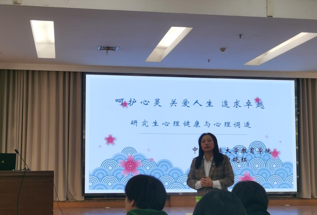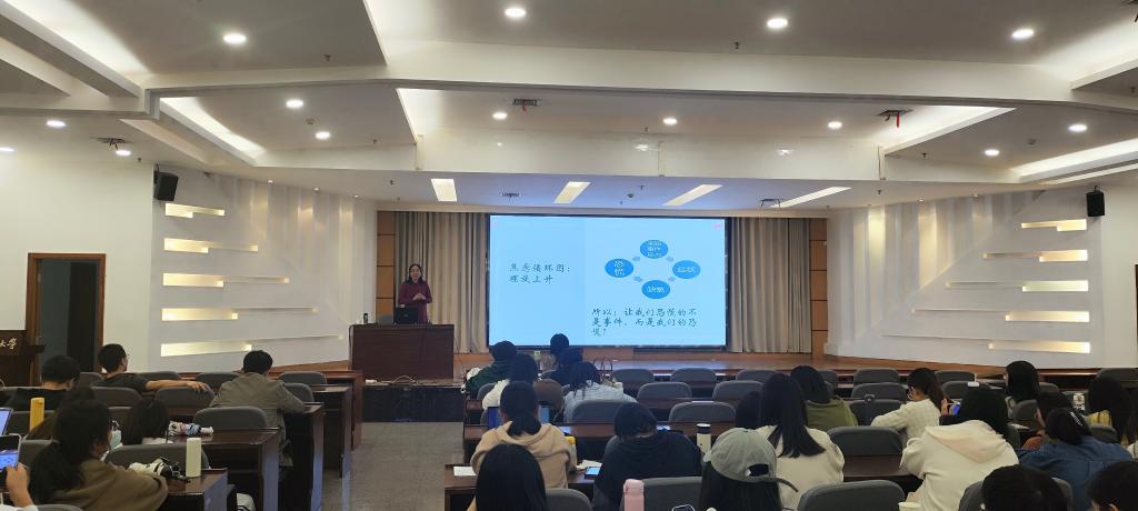 2024年10月26日晚上,beat365英国正版唯一网址教育学院教授,注册心理师,硕士研究生导师,校级教学名师,九三学社成员田晓红教授应我院之邀作《心理健康与心理调适》专题讲座。此次讲座响应了习近平总书记在党的二十大报告中关于重视心理健康和精神卫生的号召,强调了心理健康和精神卫生在公共卫生体系中的重要地位,以及作为重大民生问题和突出社会问题的紧迫性。讲座在校学术交流中心润良报告厅举行,来自管理学院研究生100多人参加会议,管理学院副院长周运兰教授主持讲座。