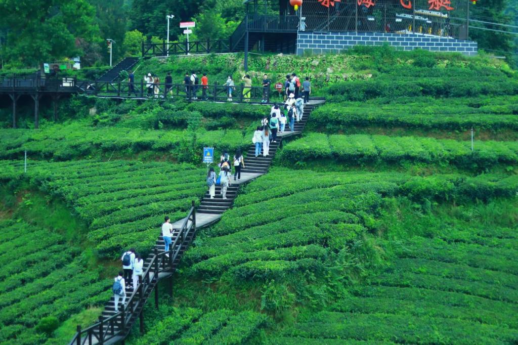 同学们收集到不少的珍贵资料,与此同时,也想要进一步了解恩施市宣恩县的历史文化,在此基础上,老师们遂组织了这次宣恩研学活动。全体同学分乘两车,从芷药坪村出发。山路的崎岖和险峻并没有影响同学们研学的积极性,在行车将近一小时后,同学们到达了第一站——伍家台村茶园。同学们在淅沥沥的小雨中欣赏茶海,结合自己最近学到的茶知识进行交流。顶着绵绵薄雨,同学们徒步行进至贡茶广场,在那里我们受到了村民热烈的欢迎,茶文化的推广大使给每人一杯茶,邀我们观看贡茶宣传片,从第三产业的角度体会贡茶文化。