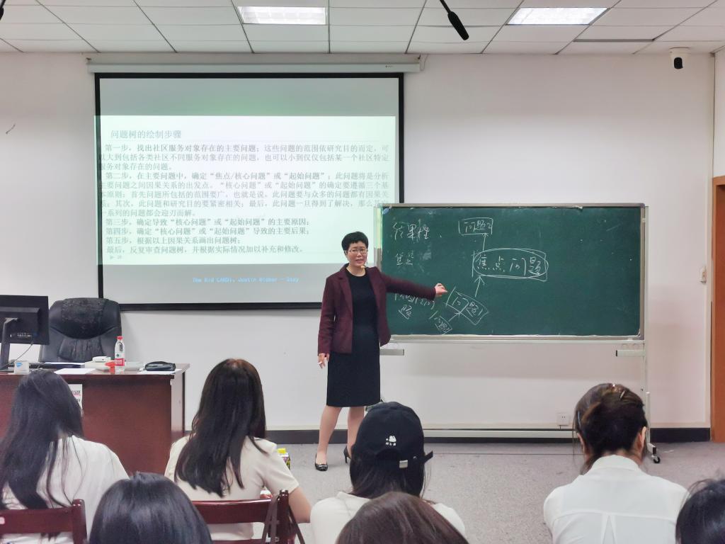 杨老师首先介绍了社会工作服务项目化运作的基本概念,社会工作服务项目是指在一定时间内,运用一定的资源,按照预定的服务目标、服务内容和服务要求,设计并实施的、能使服务群体发生改变的社会工作服务任务,以满足政府职能转移要求、现代组织管理要求和专业成效要求。杨老师将项目设计过程分为“三步骤”:在项目创意阶段阶段,要对创意进行理性思考,结合实际的需求,从而确定合适的项目主题;在项目规划阶段,杨老师提到:“在确定目标时,我们可以利用‘以终为始’的思路进行推理,先设定总目标,再分为多个具体的小目标。”为了让同学们更好的理解社会工作项目设计的思路和具体方法,杨老师以武汉某社区车辆管理难题为案例,详细解读了分析工具的用法,并在黑板现场笔书,生动形象地为同学们演示了如何绘制“问题树、目标树和策略树”,并利用这三种工具对社会工作项目进行分析。通过杨老师的讲解,同学们表示自己对如何做社会工作服务项目有了更加全面的理解,在将来的社工实务中也会更加注重社会工作服务项目的逻辑。