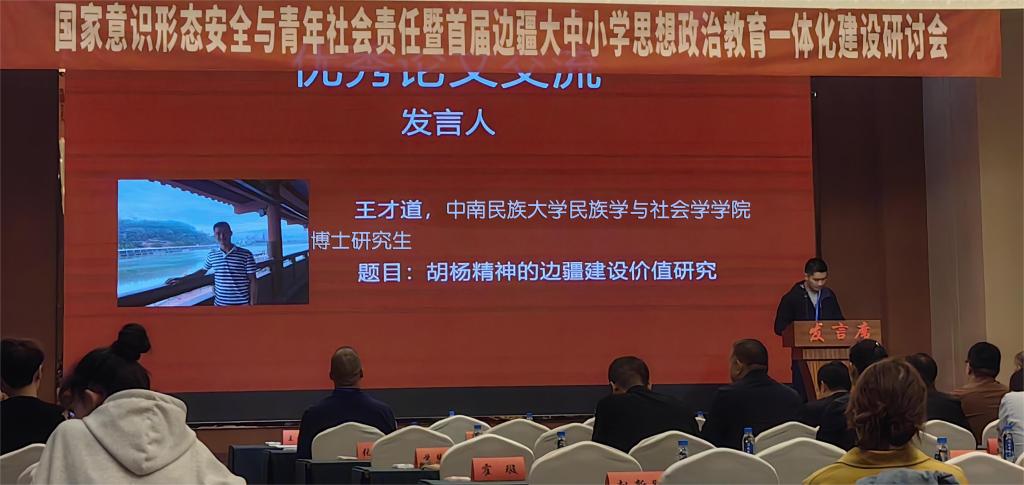 10月9日上午,国家意识形态安全与青年社会责任暨首届边疆大中小学思想政治教育一体化建设研讨会在新疆维吾尔自治区阿拉尔市塔里木大学举行。我院中国少数民族史专业博士研究生王才道、王亚辉积极参会,并在研讨会上做了题为《胡杨精神的边疆建设价值研究》的报告,报告获优秀论文二等奖。