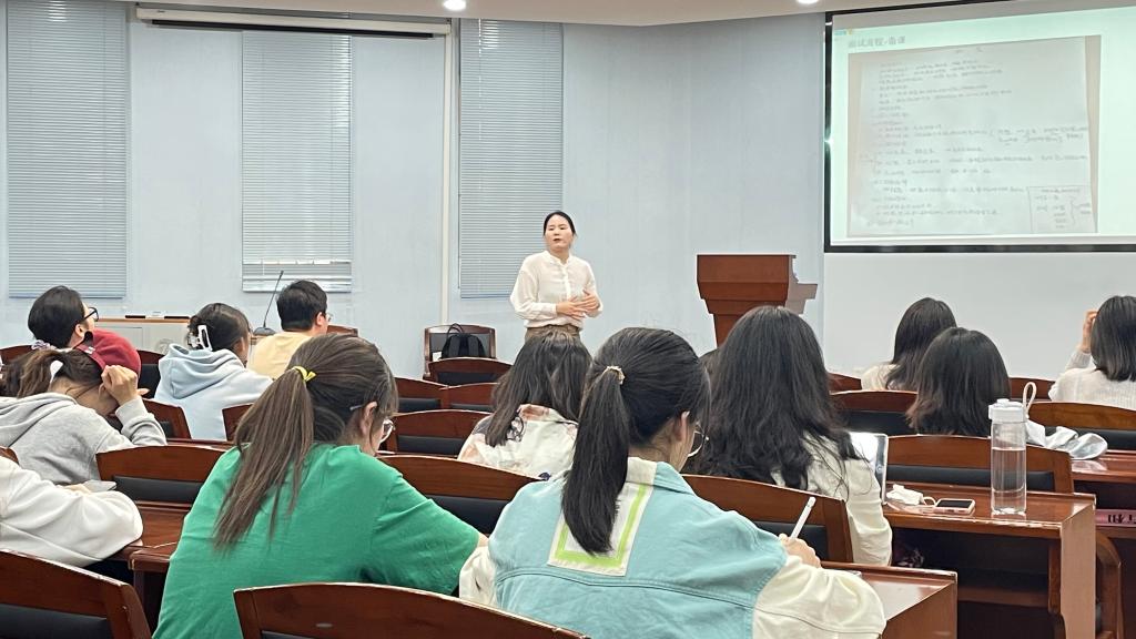 为服务民社学子顺利通过教资面试,5月4号下午,我院邀请中公教育沈丽勤老师在八角楼进行教师资格证面试应试技巧指导,本次讲座吸引了30余名大三备考教师资格证面试的学子参加。