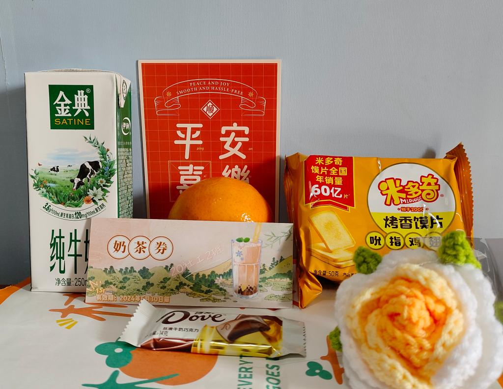 最后,黄老师为班级所有学生送上精心准备的惊喜福袋。考虑到同学们口味不同,采用定制奶茶券方式,送上一杯温暖的祝福;亲笔书写的明信片,承载了对同学们的期待、希冀与最美好的祝愿;还有橘子、巧克力、编织花等寓意大“橘”大利、人人得“芙”,饱含着对同学们的衷心祝福。暖心的礼物宛如冬日的阳光洒向每位学生的内心,祝愿每一位考研学生成功上岸,金榜题名,祝愿考公、找工作的学生一切顺利,前程似锦!