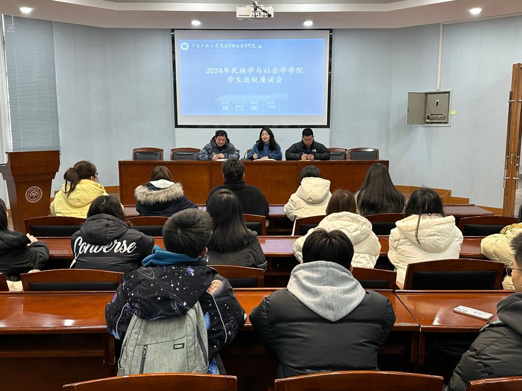 为进一步做好新学期学生开学各项工作,了解学生假期学习生活状态和对学校、学院相关工作的意见和建议,3月1日上午,我院在八角楼报告厅召开民族学与社会学学院返校学生代表座谈会。学院党委副书记王璐璐、学工办主任袁磊、2023级学生辅导员袁亚南出席座谈会,学院各年级学生代表参与本次座谈会,座谈会由2022级辅导员马博博主持。