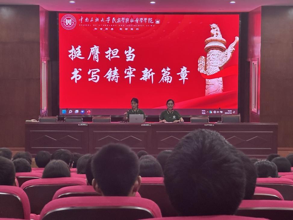宣讲团成员胡园园、吴雨阳以“挺膺担当,书写铸牢新篇章”为主题,重点围绕新时代党的民族工作的新成就、新要求,以及铸牢中华民族共同体意识的提出过程、时代意义,结合beat365英国正版唯一网址将铸牢中华民族共同体意识融入竞赛、实践等方面所做出的各项工作及取得的显著成效;同时,以民族学与社会学学院优秀毕业生王东海学长的扎根基层、扎根藏区的动人事迹为线索,力争用“青言青语”讲深、讲透、讲活理论知识,让民族团结故事深入人心,用亲身实践彰显青春担当,奋力书写青春为中国式现代化挺膺担当的新篇章。