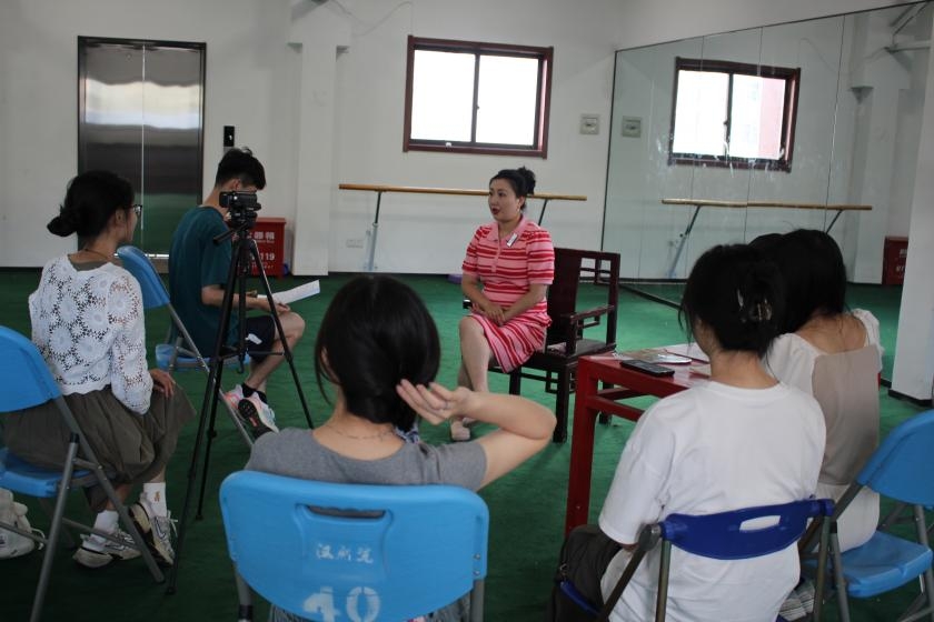 在武汉汉剧院,团队成员成功访谈到了武汉汉剧院副院长、陈派第五代传人王荔,武汉市非遗汉剧传承人、陈派第四代传人李青,汉剧院二团副团长黄志勇等包括导演、编剧、编曲、青年演员在内的10位老师。在访谈中,老师们通过形象生动、感情饱满的叙述和演示,将团队成员都带进了其所演绎的人物身上,让成员们身临其境地感受到了汉韵之美。此外,老辈汉剧表演艺术家们都表达出了培养汉剧传承人的不易。团队成员深切地体会到汉剧的传承是口传心授,老一辈汉剧名角的老去,带走了他们独特的技巧和对剧目独到的见解;老一辈汉剧票友的老去,也带去了汉剧传承与发展的重要支持力量。当前汉剧演出市场受到多种娱乐方式的冲击,生存空间受到挤压,无论是台前还是幕后,汉剧的传承都是一项极为艰难而重要的工作。团队成员王雪柔说道:“通过本次访谈,我们感到有一种历史责任感在驱使我们不仅要记录下汉剧的文化内涵和历程,更要向公众积极传播汉剧艺术的美好和厚重,要在汉剧承续与传播的过程中尽自己的一分力量。”