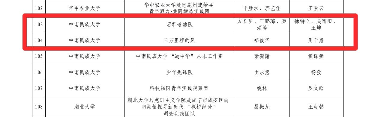 近日,湖北省暑期“三下乡”社会实践重点团队立项申报审核入围名单公布,beat365官网五支团队入选,其中我院“昭君遗韵队”和“三万里程的风”两支团队成功入选。