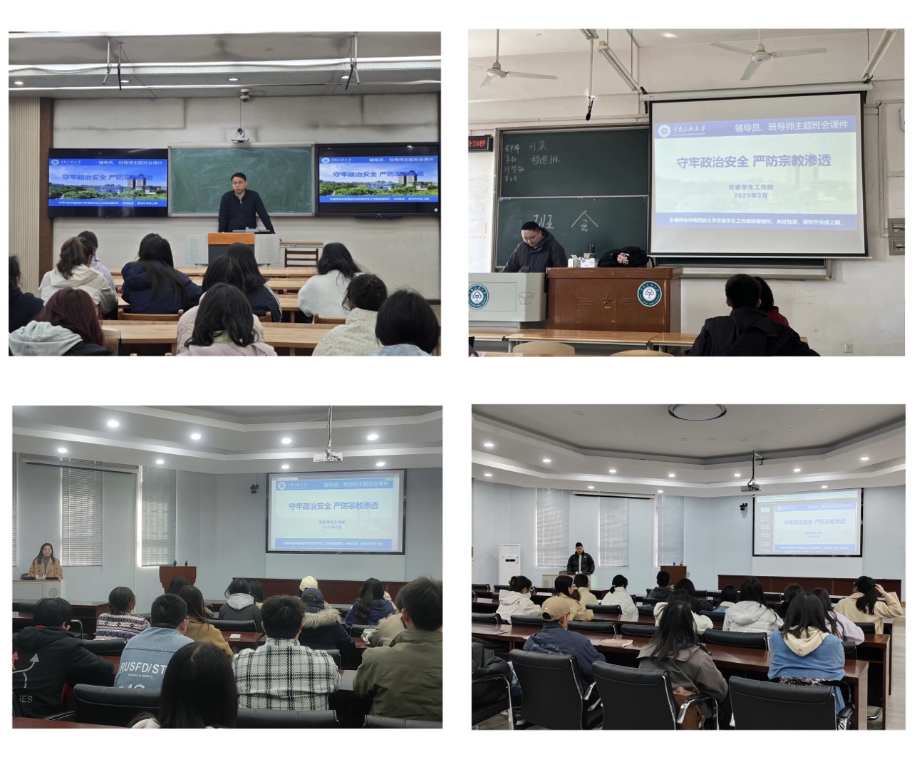 班会期间,各班班导师组织开展学习习近平总书记重要讲话精神,详细解读了我国关于宗教管理的法律规定选编,重点强调“两个不得”“五个严禁”要求,为构建平安和谐校园奠定了坚实思想基础。通过展示典型案例,结合当前国内外形势,班导师系统讲述了政治安全的核心内涵,提醒同学们警惕宗教渗透,坚定贯彻教育与宗教相分离的基本原则。