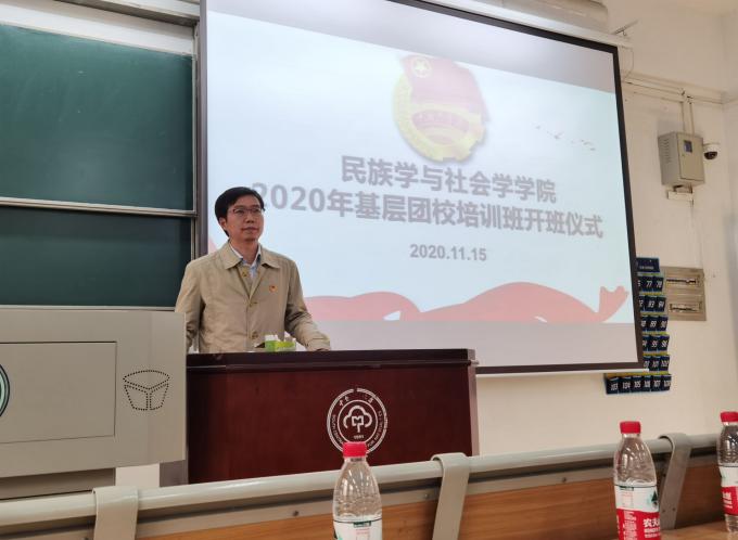 11月15日上午,民族学与社会学学院2020年基层团校培训班开班仪式及团课第一讲在11栋206教室举行。20级培训班全体学员;团委书记阿拉木斯江·喀迪尔、20级辅导员王亚辉老师、团委副书记丁家瑞等团学组织负责人共计70余人参加开班仪式,我院党委副书记黄承权老师出席仪式并讲话。仪式由团委书记阿拉木斯江·喀迪尔主持。