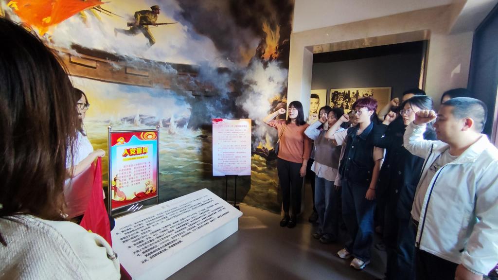 翠柏青松伴英烈,丰碑矗立颂英魂。上午,同志们怀着对革命先烈无限崇敬的心情共同走进贺胜桥北伐阵亡将士陵园,在庄严肃穆的将士墓前,全体师生肃立默哀,列队鞠躬,表达对革命先烈们的崇高敬意和深切悼念。接着,同志们步入了北伐阵亡将士纪念馆,馆内详细再现了贺胜桥战役的始末、战役中的英雄故事以及该战役的历史意义等。同志们驻足凝神,认真参观,重温先烈的英雄事迹,学习先辈的革命精神。随后,王振威同志带领全体师生面向党旗,重温入党誓词。大家高举右手,目光坚定,铮铮誓言,铿锵有力,展现了每一位同志不忘初心,砥砺前行的决心。