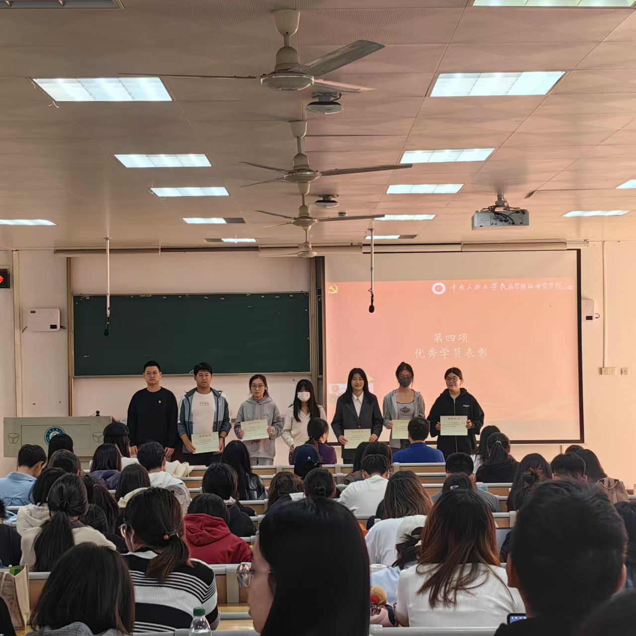 会议伊始,结业仪式在庄严肃穆的国歌声中拉开帷幕。党校培训班各小组代表依次上台汇报学习成果。风采展示环节,各小组采用微党课、朗诵等形式阐述习近平总书记讲过的民族团结进步故事。随后,袁亚南宣读了优秀学员表彰决定,学工办副主任袁磊、团委副书记马博博及2021级辅导员张舒依次为培训班优秀学员颁发荣誉证书。