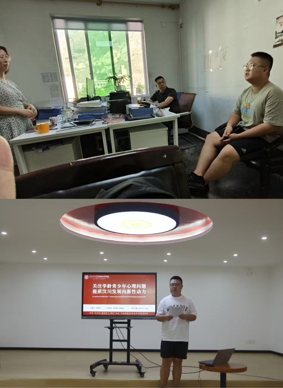 图为团队成员在汶川县民政局进行面对面调查以及在汶川县无忧青少年提案进行提案汇报