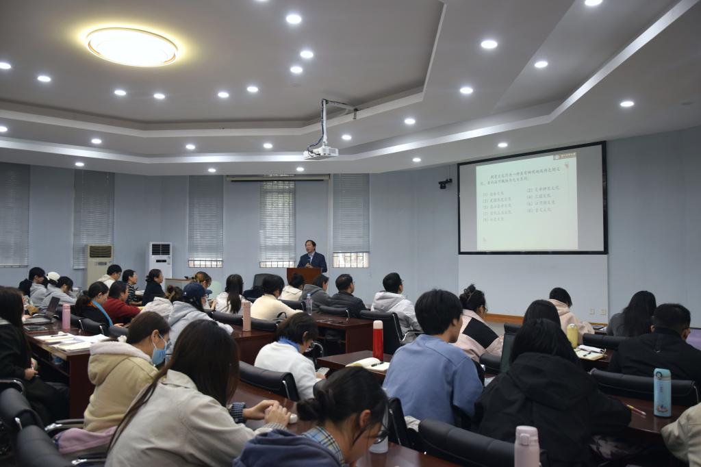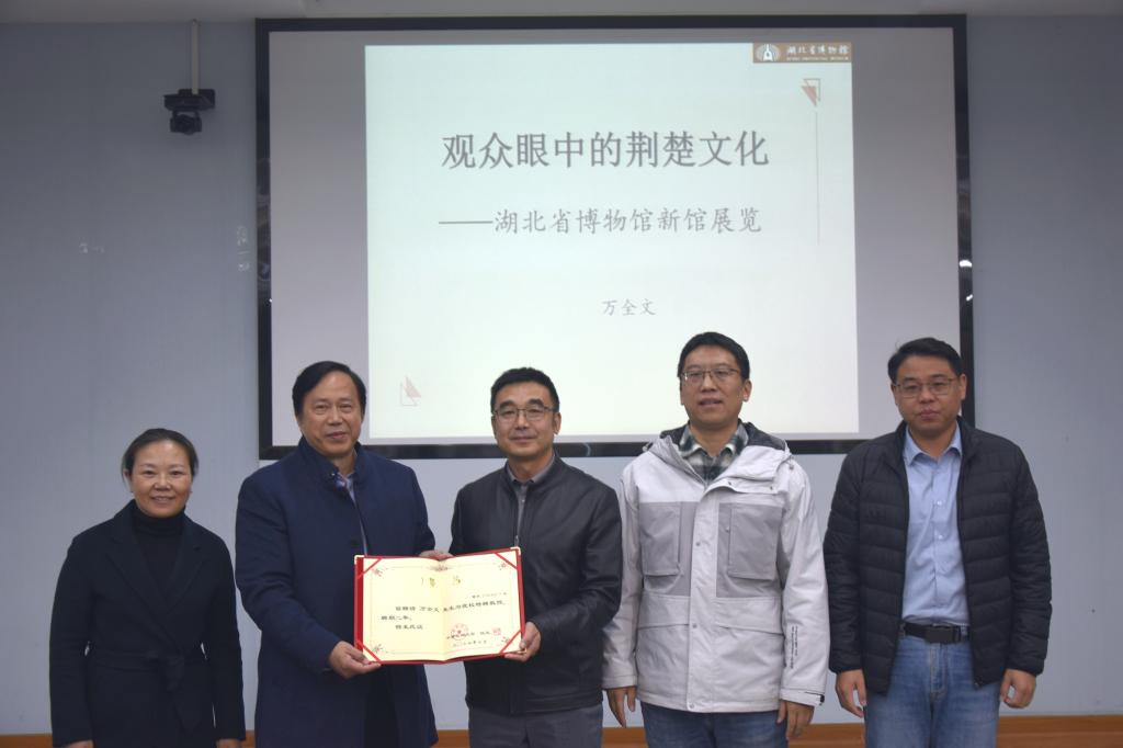 11月22日,湖北省博物馆、湖北省文物考古研究所原党委书记兼常务副馆(所)长、二级研究馆员、国务院特殊津贴专家万全文应邀做客泽霖讲坛,在八角楼学术报告厅开展题为“观众眼中的荆楚文化——湖北省博物馆新馆展览”的讲座。讲座由文博教研室庾华教授主持,陈祥军院长、高晶晶、胡飞老师及文博专业全体同学参加了讲座。