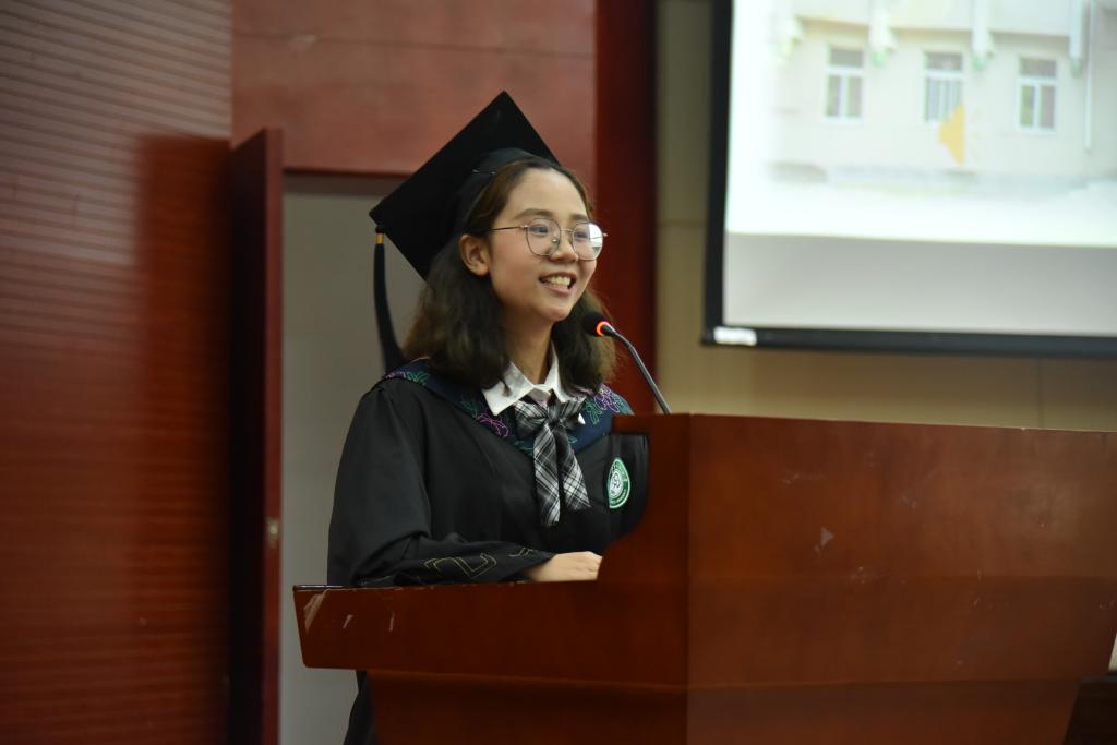 在校学生代表黄蓉追忆往昔,对学长学姐们曾给予的帮助表示感谢:四年时光匆匆,如今互道珍重,愿永葆初心、永葆清澈纯粹,有勇气、有志气、有骨气、有底气,在实现人生理想、奏响人生乐章的征途中绽放最美的浪花。