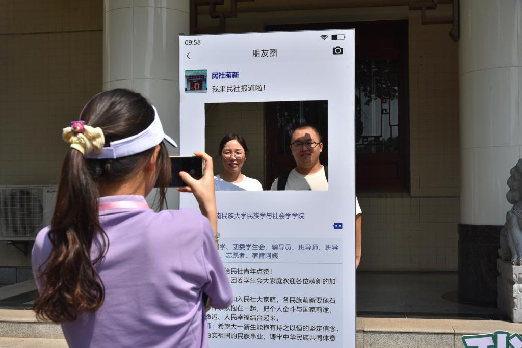 迎新现场,新颖有趣的朋友圈拍照打卡点吸引了众多新生的眼球,大家纷纷驻足,拍照留念。新生们在志愿者一对一的引导和班助们细心认真的帮助下有序进行报道。考虑到天气炎热、现场人流量大等情况,学院贴心地为新生和家长准备了面包和饮用水,并开放八角楼供其休息,让学生看得见、触得着,近距离感受学院的温情与关怀。我院2020级社工专业黄靖怡同学和她的原创歌曲《南湖畔》也一起来到迎新现场,为新生送上一首首动听的歌曲,让新同学们在歌声中寻觅到期许一路的归属,暖心进校园。
