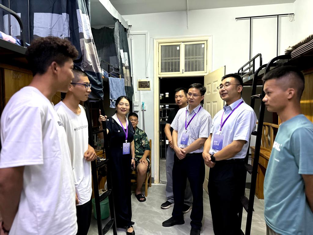 学院领导高度重视迎新工作的开展情况,多次来到迎新现场慰问志愿者和新生们,并于8日晚由党委书记钱文彬和院长陈祥军带队前往新生寝室,走访关心即将军训的新同学,了解新生们的生活情况,帮助解决实际困难。“家住哪里啊?”“新环境能否适应?”“基本生活用品能否保障?”“宿舍里空调效果怎么样?”“军训准备做得如何?”……学院领导深入各个新生宿舍,每到一处,都与在寝新生亲切交流,细心的询问和贴心的关怀让新同学们倍感温暖,增强了新生对学院的归属感和认可度。副院长唐胡浩和研究生辅导员席钰萍走访了2023级研究生新生宿舍,欢迎各位研究生的到来,转达学院对研究生学习发展的殷切期望。