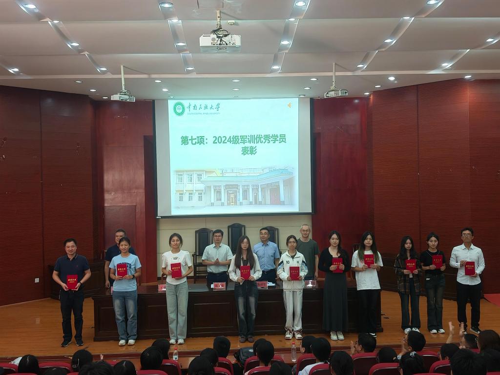 副院长方长明宣读《关于表彰2024级军训先进集体和先进个人的决定》,向我院十位获得2024级军训“优秀学员”荣誉称号的同学、获得2024级军训“优秀指导员”荣誉称号的袁磊老师表示祝贺。学院领导一同为他们颁发荣誉证书,鼓励2024级新生在今后的学习生活中继续发扬“吃苦耐劳、不畏艰苦”的精神,成为“德智体美劳”全面发展的民社青年。
