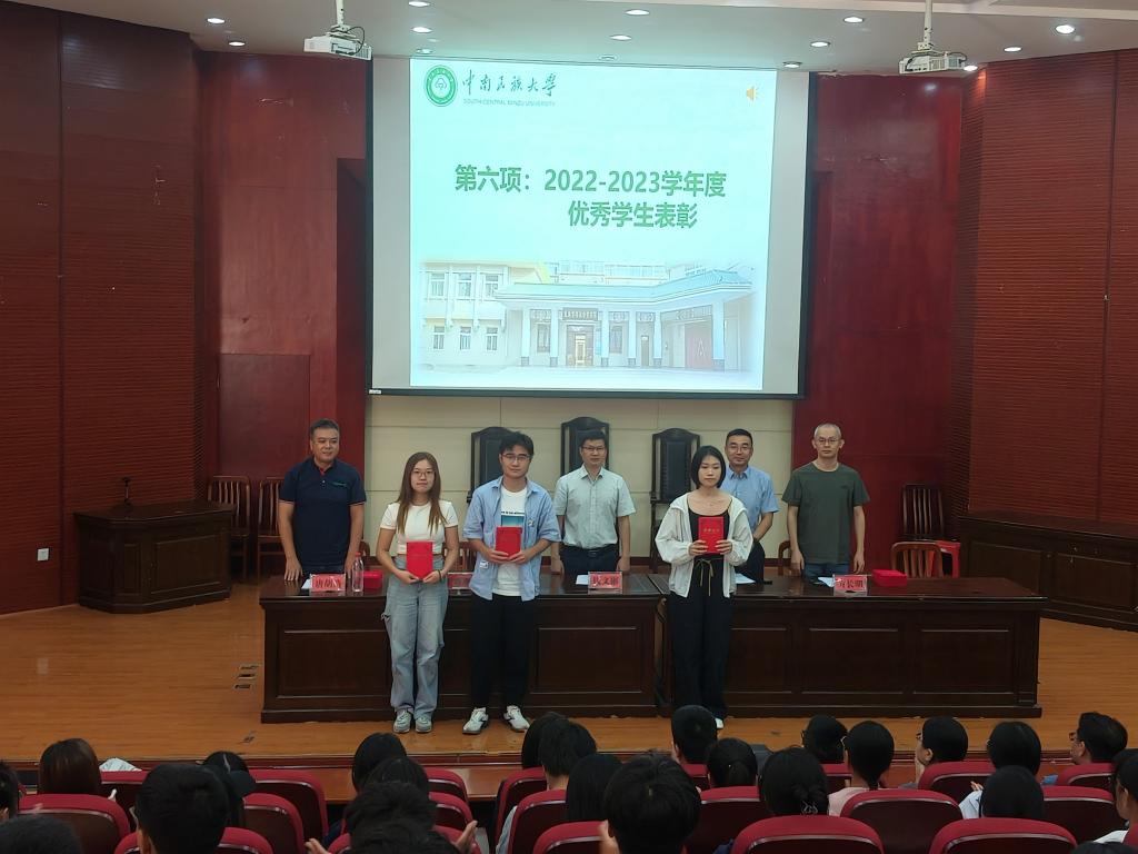 院党委书记钱文彬宣读《关于表彰2022-2023学年度“国家奖学金”获得者的决定》,并为国家奖学金获得者代表颁奖,激励2024级新生向榜样看齐。