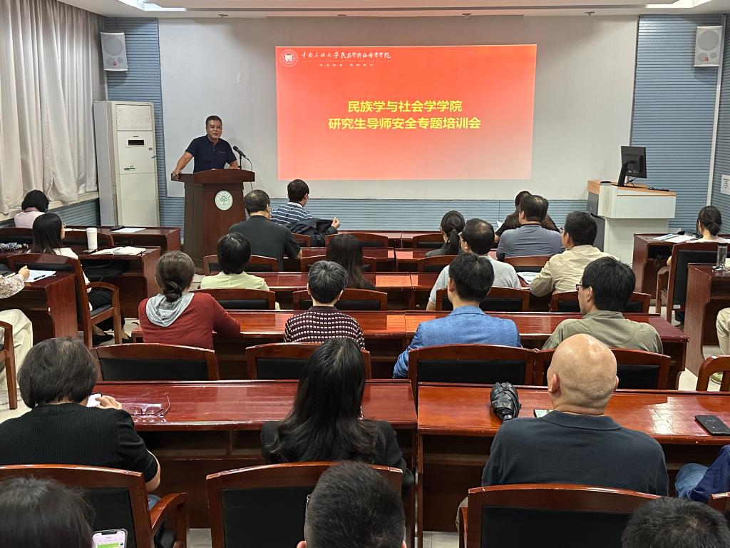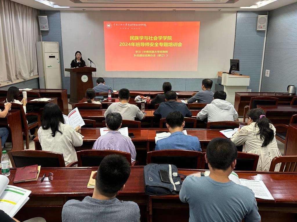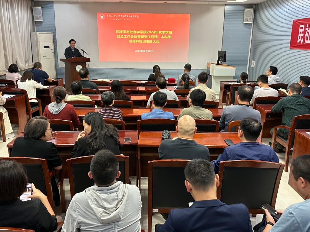 2024年10月17日下午,民族学与社会学学院在学院人类学实验室召开2024年秋季学期安全工作会议暨研究生导师、本科生班导师培训、表彰大会。院党委书记钱文彬,党委副书记、院长陈祥军,党委副书记王璐璐,副院长唐胡浩,全体辅导员、研究生导师、本科生班导师出席了本次会议。会议由钱文彬主持。