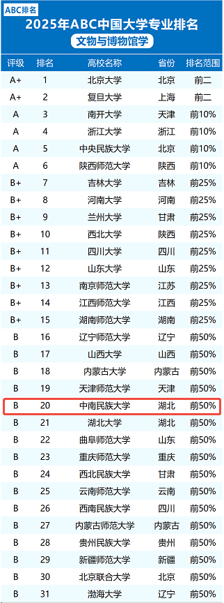 5月27日,中国大学排行榜(CNUR)网站正式发布了《2025年ABC中国大学专业排名:文物与博物馆学》,文物与博物馆学专业B类及以上高校共31所,我院文物与博物馆学专业入围全国20强。
