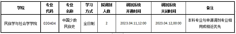 民族学与社会学学院2023年硕士研究生网上调剂系统于4月11日12:00正式开通,4月12日00:00关闭。收到复试通知的调剂考生应按通知要求进行复试确认、参加学院线下复试,复试内容参照《民族学与社会学学院2023年硕士研究生复试录取实施细则》(学院官网已发布)。