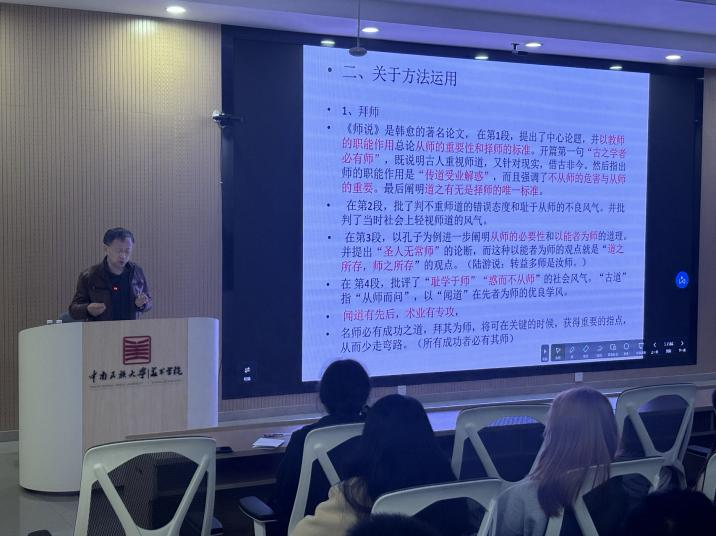 讲座分为两个部分。第一部分是从理论上为同学们讲解关于学习创作过程中的目标制定和方法运用。通过对学习目标的制定、学习方法的运用、学习时间的安排和关于如何阅读、做笔记与资料搜集等四个方面为同学们提供指导。在关于目标的制定上,鲁虹老师告诉同学们要尽早确立人生目标,保持着对本专业的热爱,并一直坚持不放弃,寻找各种办法才能有收获。在方法运用上,鲁虹老师结合自己的青年学习经历总结出要拜好老师并找到志同道合的好朋友两个方面。在时间安排上和学习习惯上也给大家传达了自己的独特学习方法。
